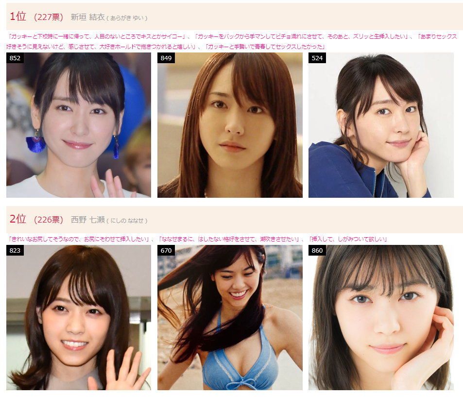 2位は西野 七瀬。 意外。 「ななせまるに、はしたない格好をさせて、潮吹きさせたい」 とのコメント。 それは青春エッチなのか? エロエロエッチだと思うけど、確かに、乃木坂系の子にはしたない格好をさせるのはすごく興奮する。